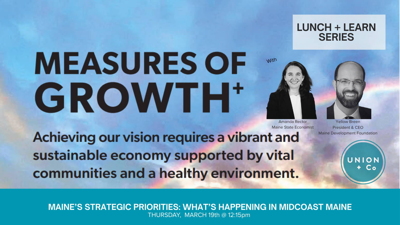Maine Development Foundation (MDF) has a Measures of Growth report with data points tied to the economic performance of Maine - why is this important? Hear from Yellow Breen, President of MDF and Amanda Rector, Maine State Economist, about which indicators we should be paying attention to, and what's happening in the Midcoast. Moderated by Michael Walton, President & CEO of First Federal Savings.